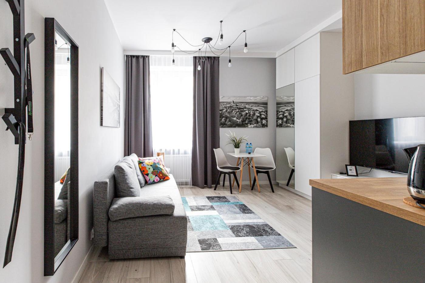 Studio. The studio provides a washing machine, a private entrance, as well as a private bathroom featuring a shower and a hairdryer. The well-equipped kitchenette features a stovetop, a refrigerator, kitchenware and a microwave. This studio offers an electric kettle, a flat-screen TV and city views. The unit offers 1 bed. Studio - 2 osobowy. Powierzchnia pokoju ok.: 25 mkw. ;